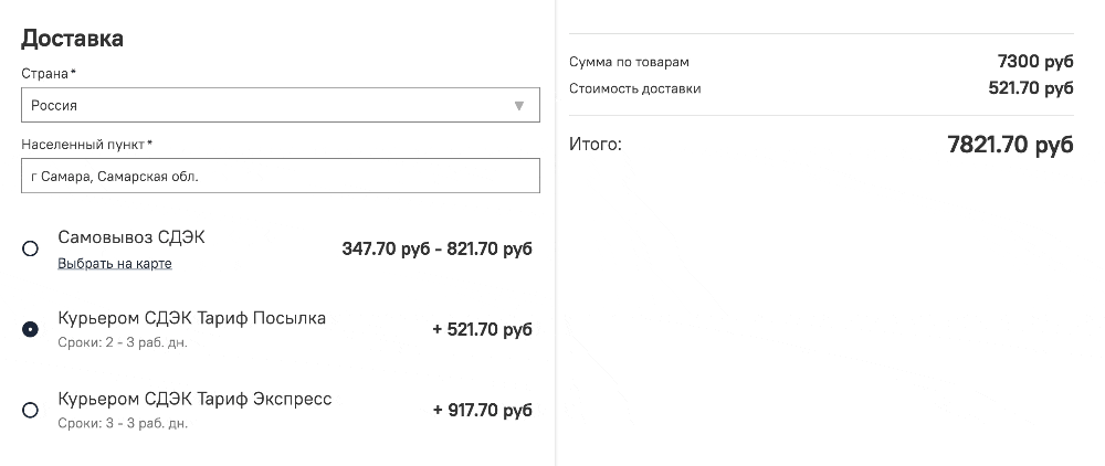 При выборе тарифа стоимость доставки автоматически добавляется к общей стоимости заказа.