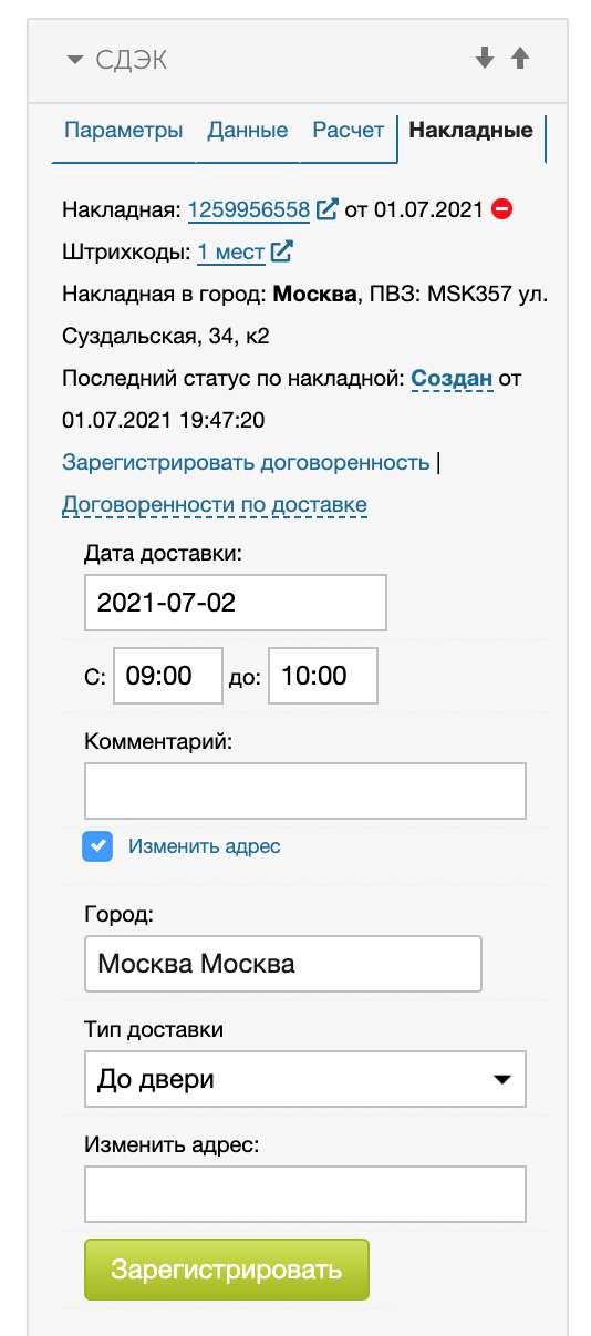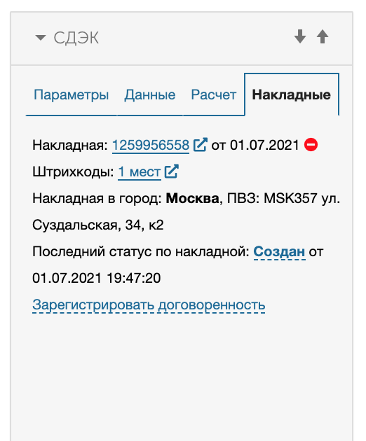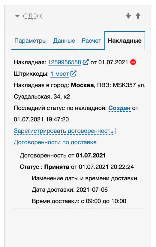 В этой части виджета выводятся все созданные по заказу накладные СДЭК, а также их последний статус, краткая информация и возможность зарегистрировать договоренность о доставке.