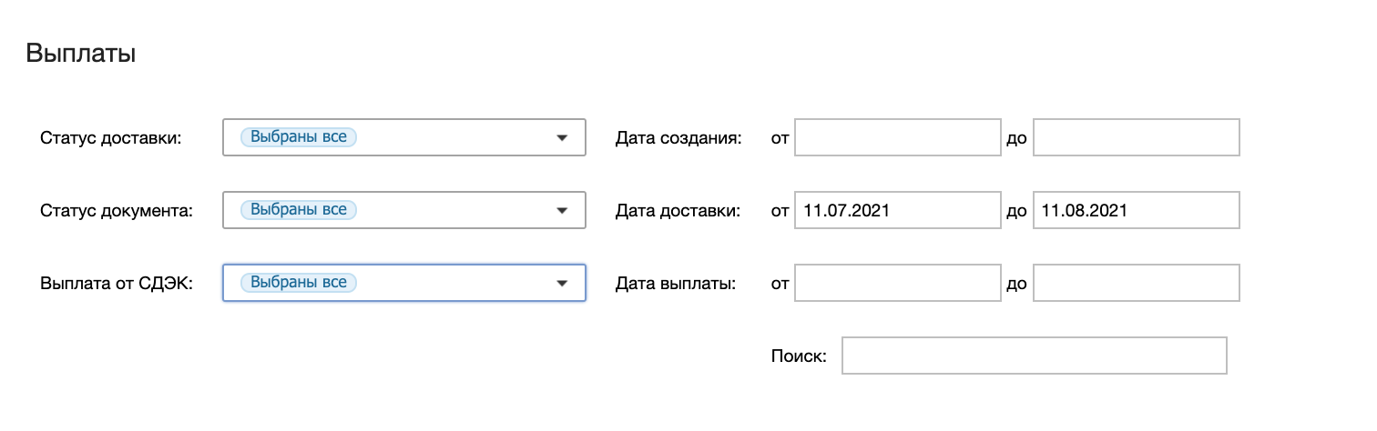 В разделе Выплаты отображаются только доставленные накладные (в статусах Вручен и Вручен частично) с наложенным платежом, по которым СДЭК произвел выплату.
