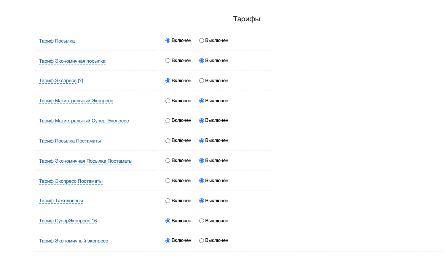 В данном разделе пользователь может включить нужные тарифы для расчета. Стоит заметить, что некоторые тарифы могут быть недоступны клиенту, или ограничены по региону доставки.