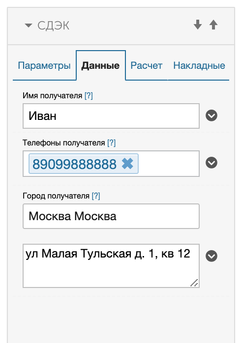 В данной части виджета указывается информация по клиенту (имя, телефон, адрес, город доставки), которая будет в последствии передана в накладную СДЭК.