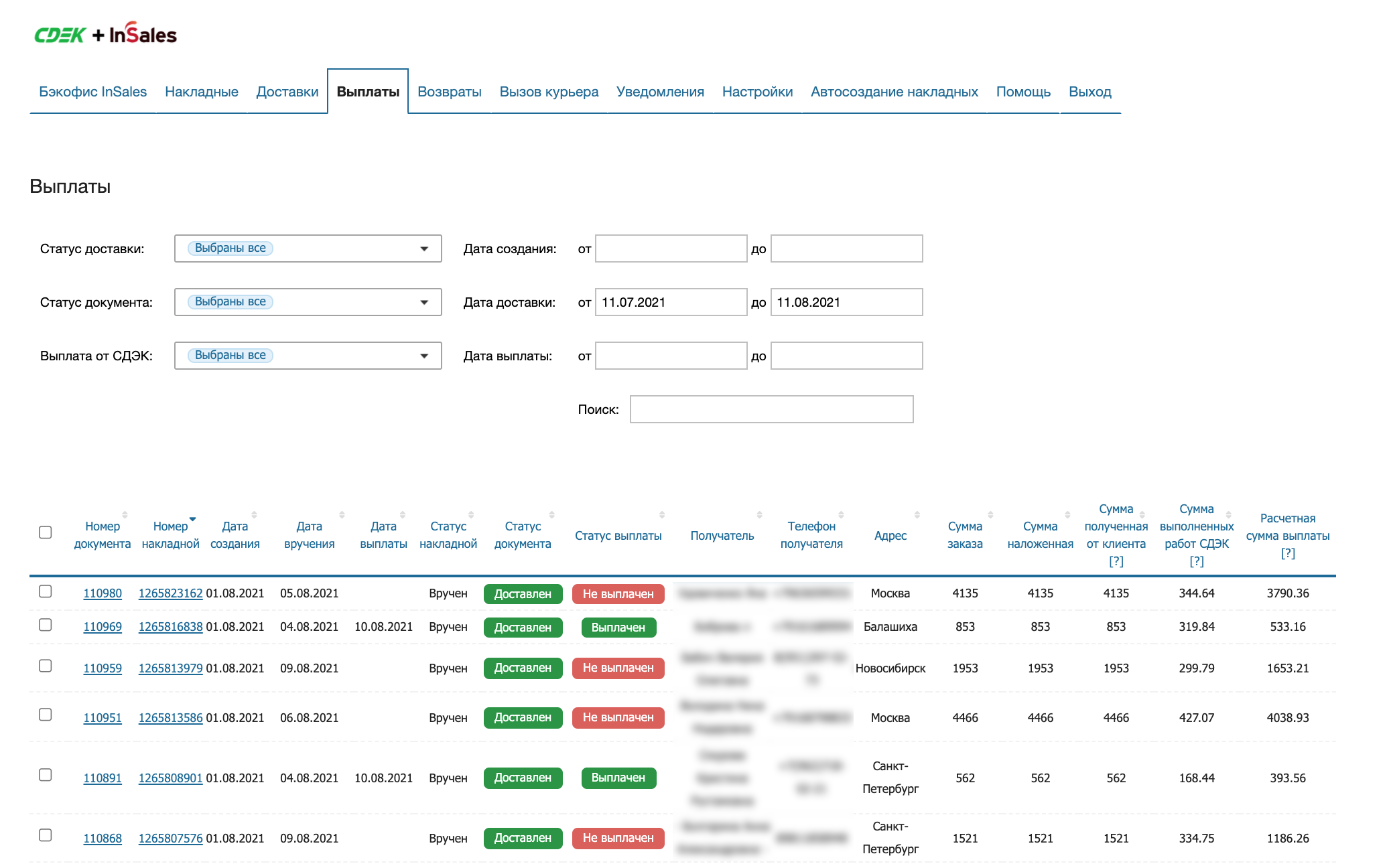 В разделе Выплаты отображаются только доставленные накладные (в статусах Вручен и Вручен частично) с наложенным платежом, по которым СДЭК произвел выплату.